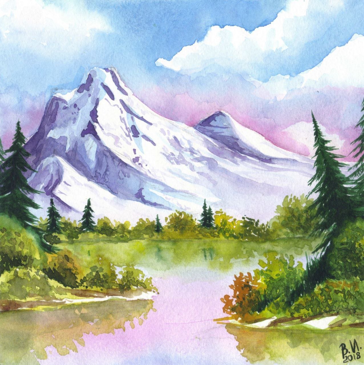 ![Горы и озеро акварель]()
