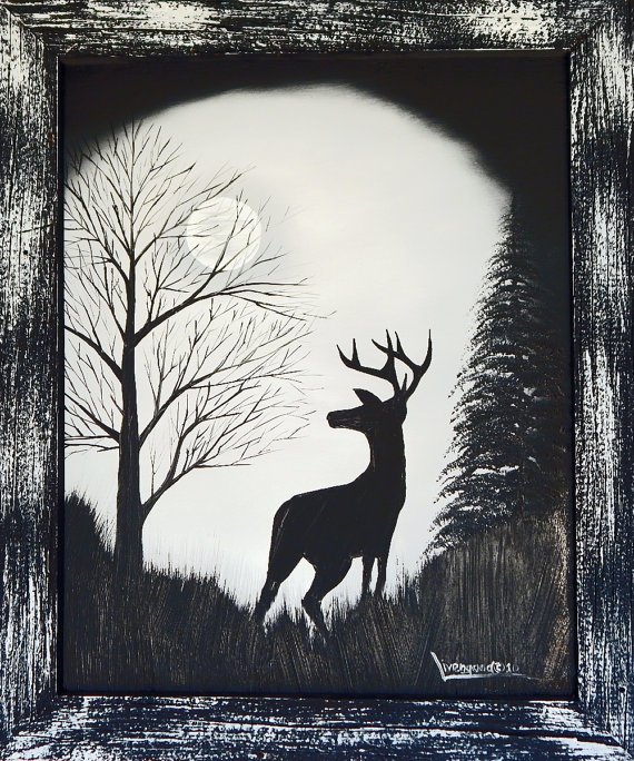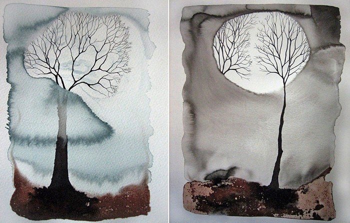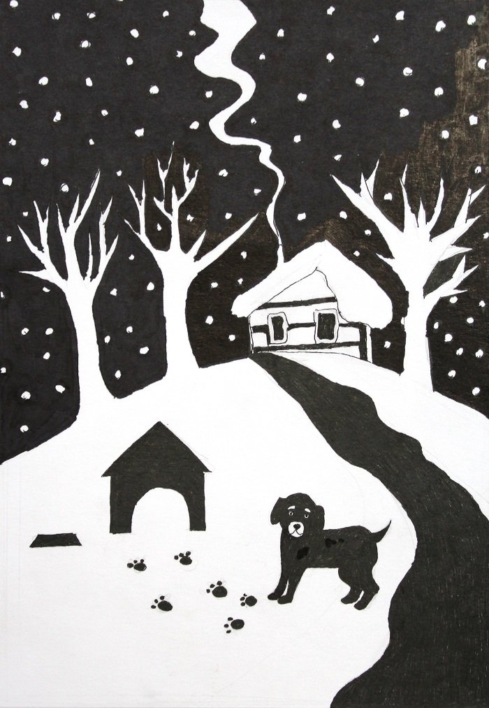![Зимний пейзаж белой гуашью на темном фоне]()