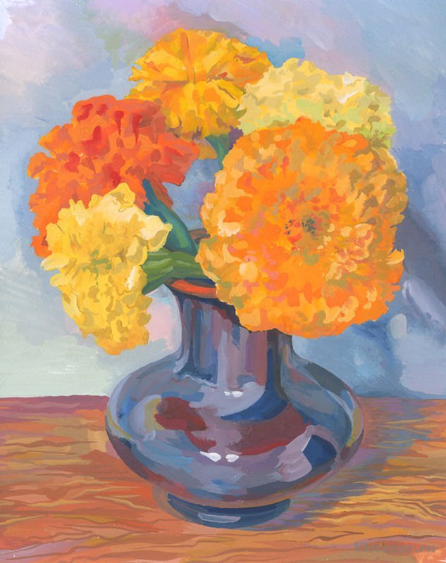 Букет в вазе, изображенный гуашью на холсте, привлекает взгляд своей яркостью и нежностью. Каждый лепесток цветка, каждая капля росы на листьях прорисованы тонко и детально, создавая ощущение живой природы. Разнообразие цветов и их сочетание добавляют в букет игры и гармонии. Благодаря умелому использованию гуаши, художник передает всю красоту и элегантность цветов, заставляя зрителя восхищаться этим произведением искусства. Этот рисунок станет прекрасным украшением для интерьера и подарком для любителей искусства.