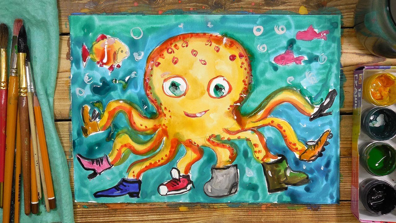 ![Рисование осьминог красками]()