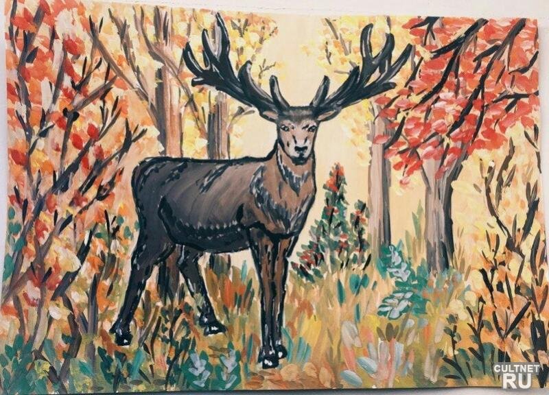 ![Олень в лесу гуашью]()