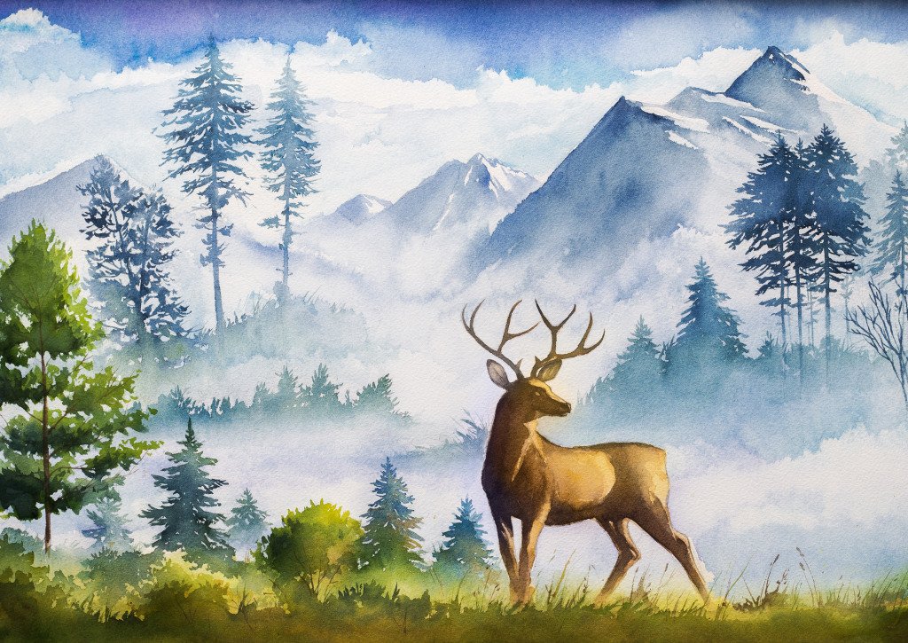 Пейзажи с оленями акварелью