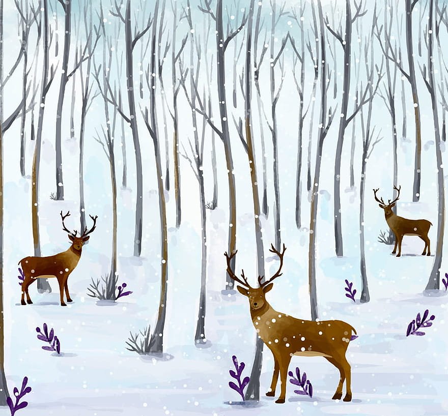 ![Зимний лес акварель олень]()