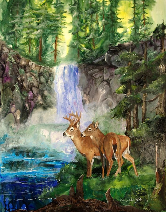 ![Пейзажи с оленями акварелью]()