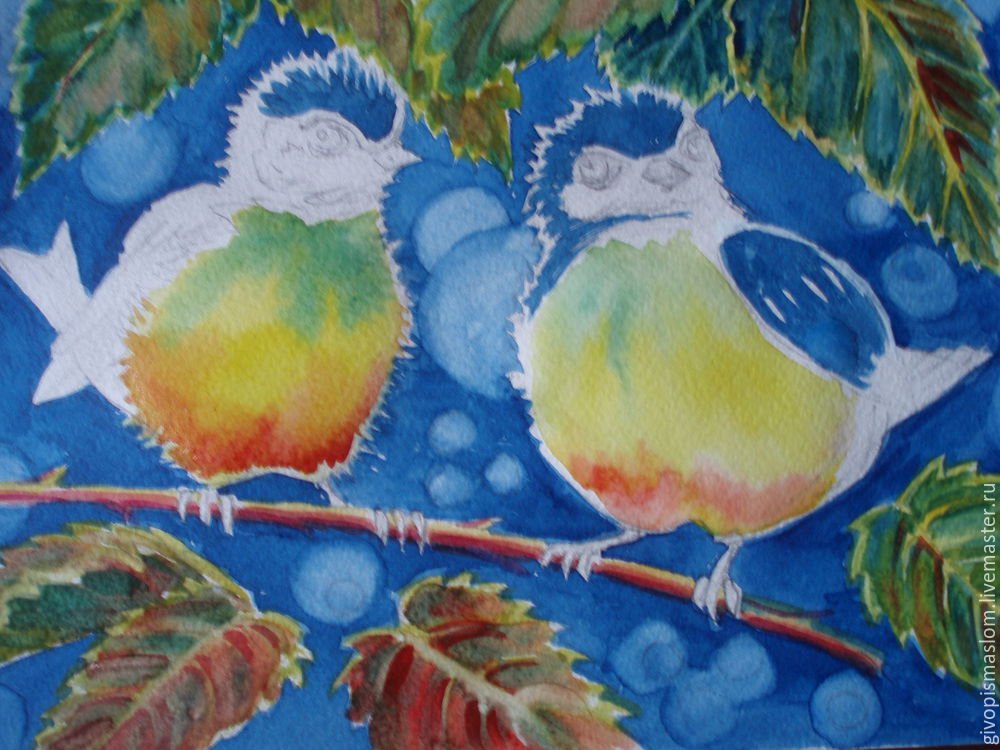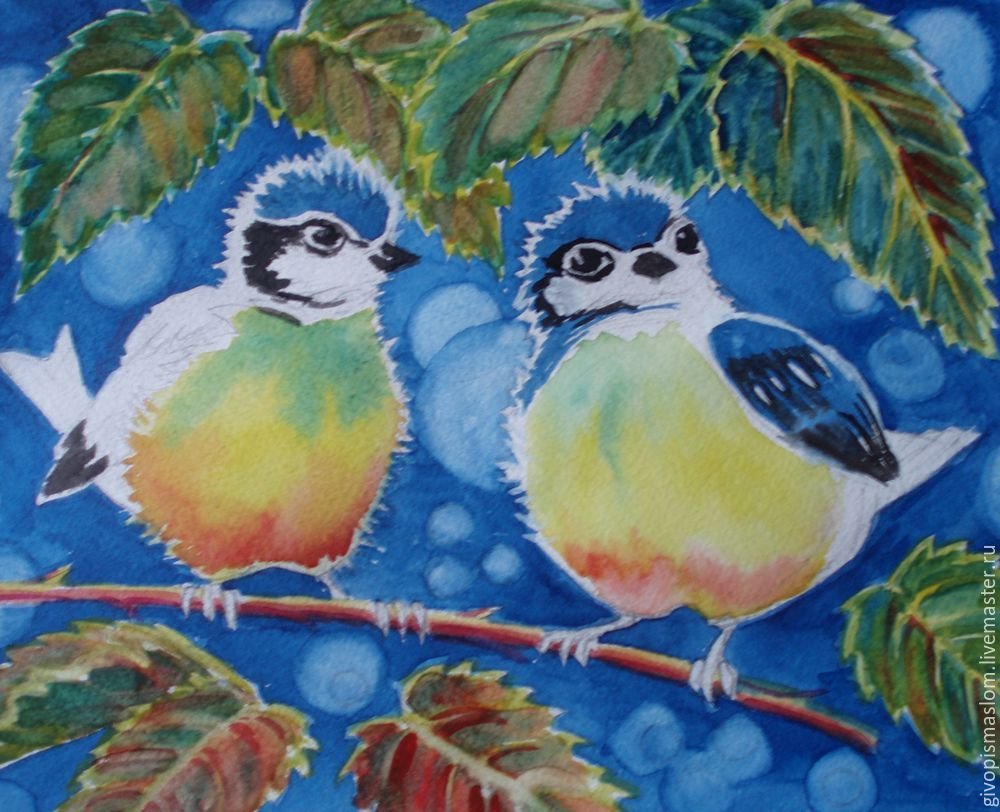 ![Синички на ветке краской]()