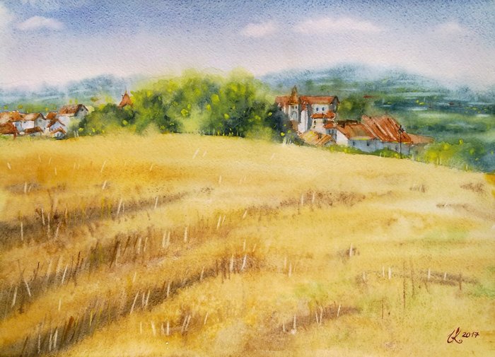 ![Деревенский пейзаж акварелью]()