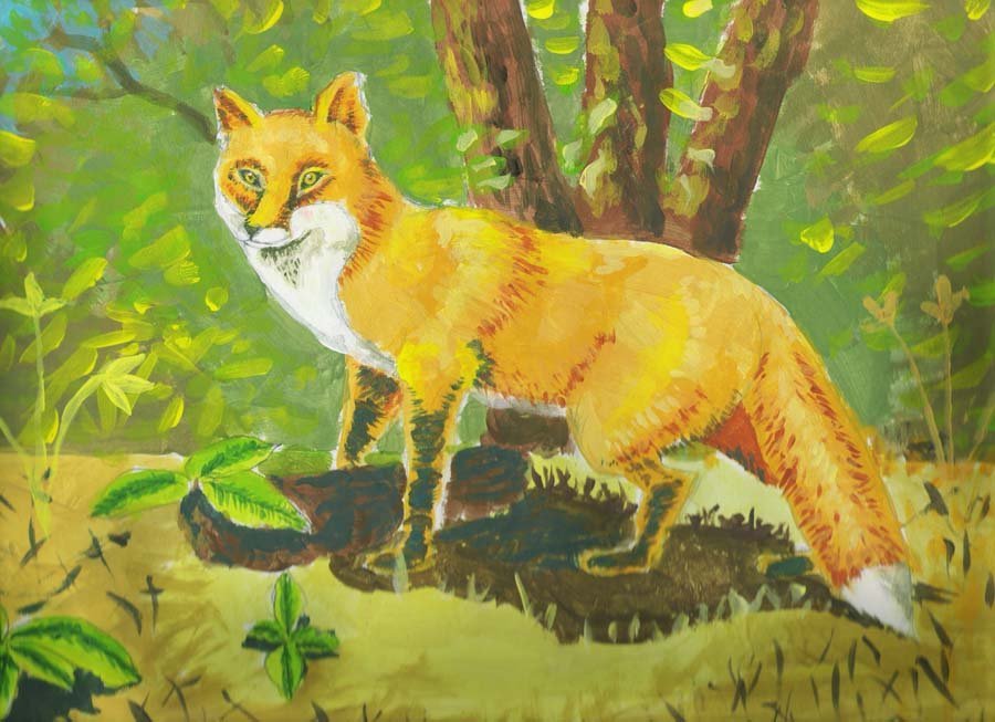 Представь себе прекрасный рисунок, выполненный гуашью, на котором изображена лиса в загадочном лесу. Картина притягивает внимание своими яркими и насыщенными цветами, создающими ощущение живой природы. Лиса изображена с изумрудно-зеленым мехом, который прекрасно сочетается с фоном пышных деревьев и густой листвой. Ее глаза сияют умным блеском, а грациозная поза передает ее неповторимую элегантность и хитрость. Весь рисунок создает атмосферу загадочности, природной красоты и дикой природы, заставляя зрителя окунуться в этот прекрасный мир лесной жизни.