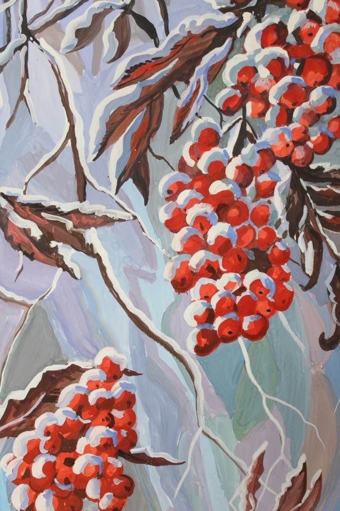 Рябина в снегу гуашью