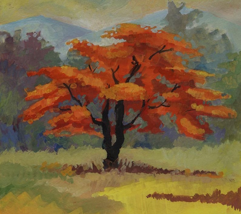 Осеннее дерево на рисунке, выполненном с использованием гуаши, переносит нас в прекрасную осеннюю атмосферу. Яркие и теплые оттенки оранжевого, красного и желтого создают ощущение пышной осенней листвы, которая медленно опадает с веток и образует ковер из ярких листьев на земле. Каждая ветка дерева, каждый сгиб ствола тщательно проработаны, делая рисунок реалистичным и живописным. Этот рисунок непременно подарит тепло и удовольствие, напоминая о прекрасном времени года – осени.