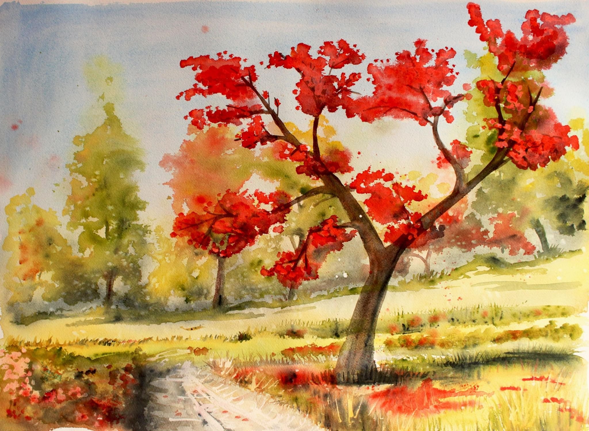 Рисование осеннего пейзажа акварелью