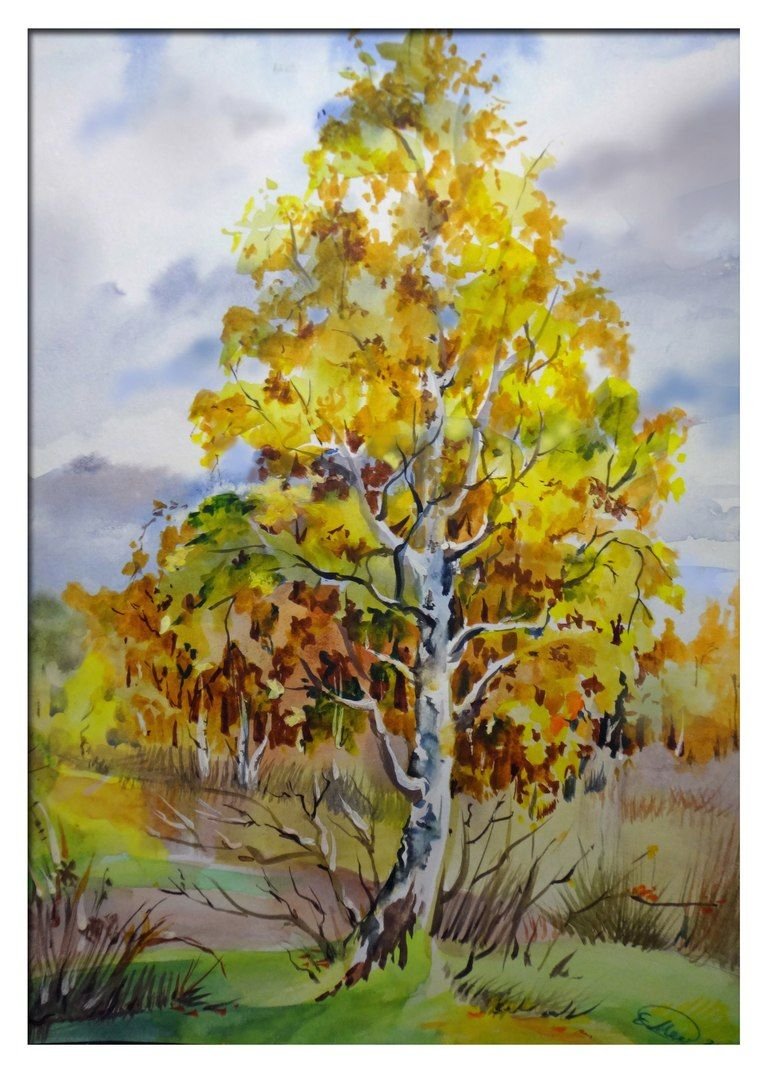 ![Осеннее дерево акварелью]()