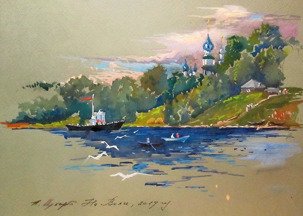 ![Река Волга акварелью]()