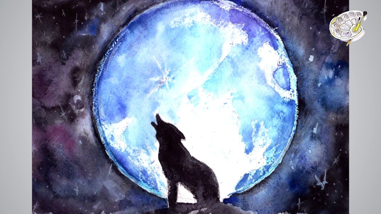 ![Акварель волк воет на луну]()
