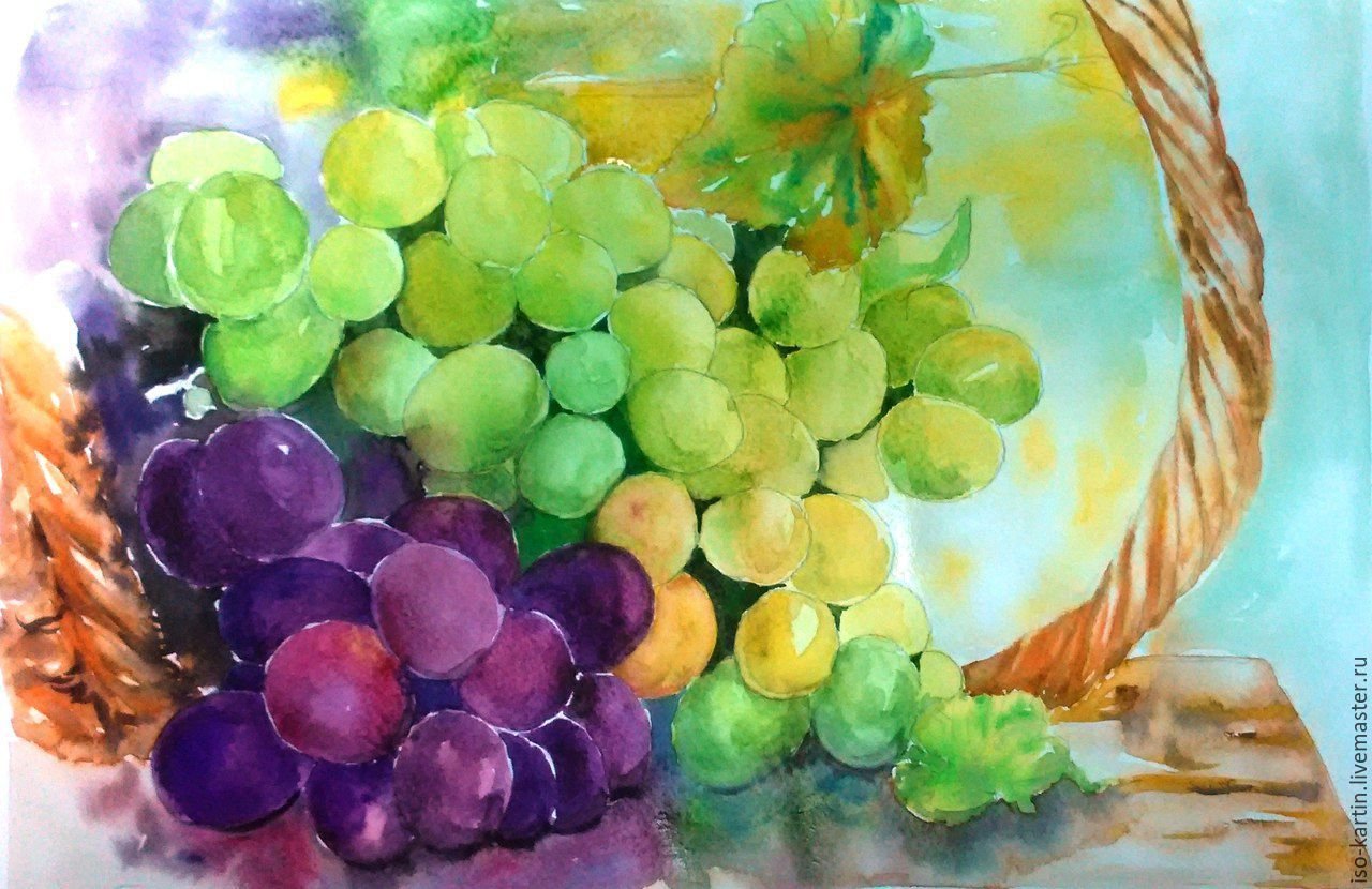 ![Натюрморт с виноградом акварель]()