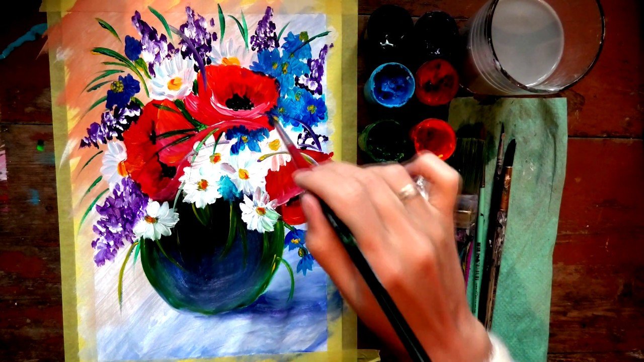 ![Букет цветов в вазе гуашью]()