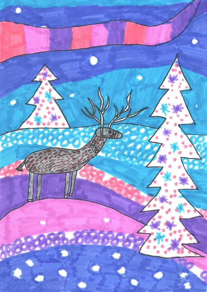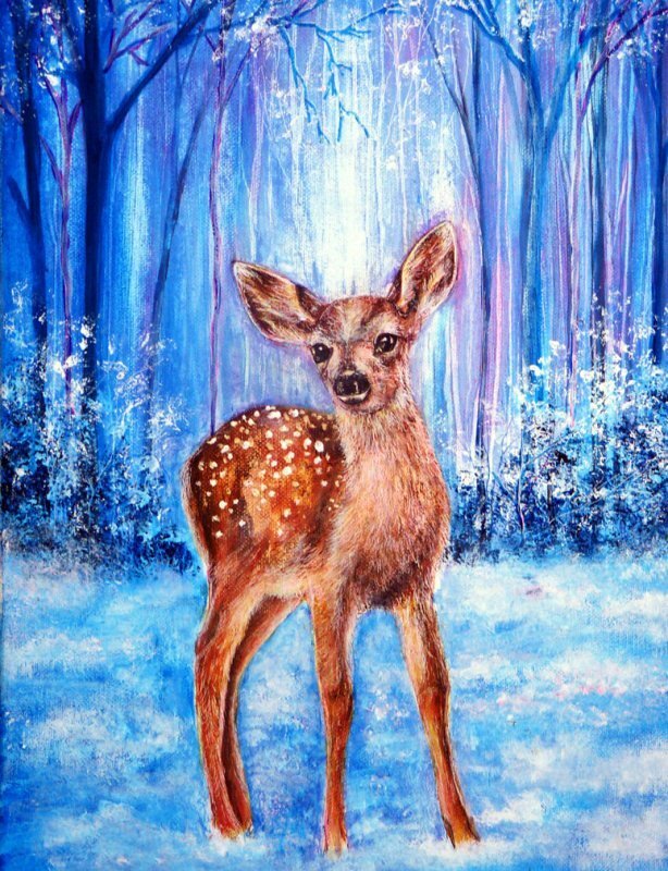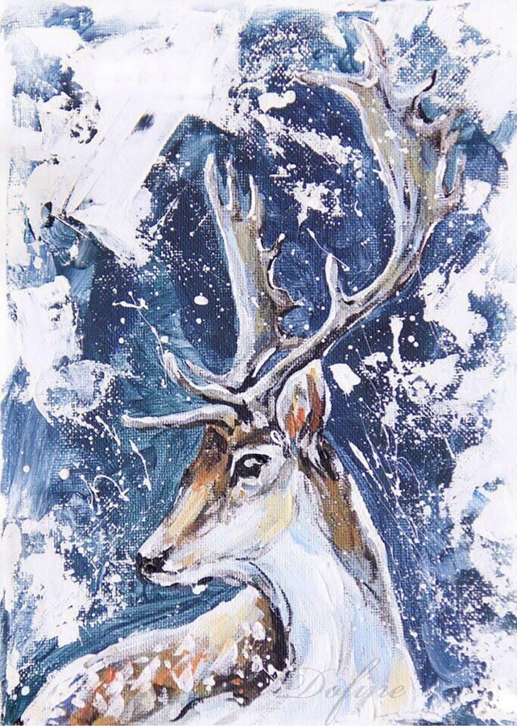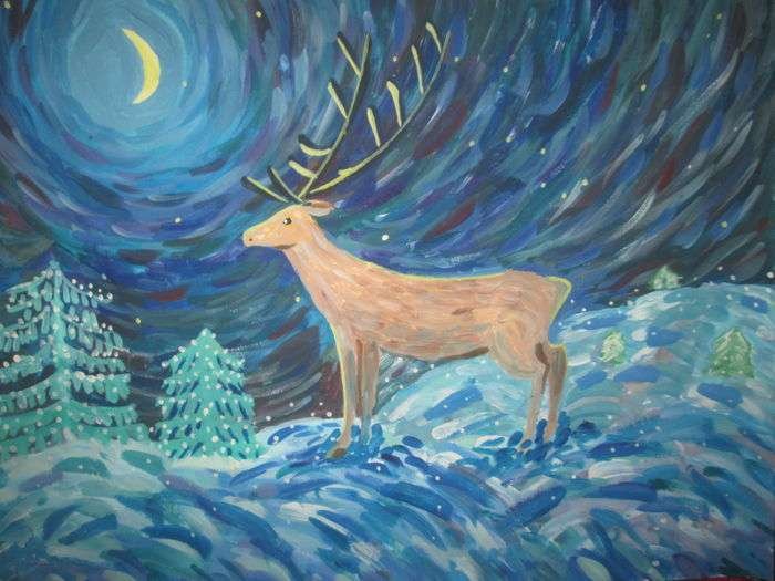 Замерзшая зимняя панорама оживает на этом потрясающем рисунке, выполненном гуашью. Представь себе снежное поле, покрытое свежим снегом, на котором стоит величественный олень. Его мощные рога выделяются на фоне яркого неба, окрашенного в голубые и розовые оттенки заката. Чистота цвета и техника гуашевой живописи создают реалистичность и глубину этого зимнего пейзажа. Ты почувствуешь холод воздуха и слышишь тихий шорох снега под копытами оленя, просто глядя на эту картину. Она пробуждает чувство волшебства и приглашает вас окунуться в волшебный мир зимы. Этот рисунок идеально подойдет для украшения интерьера или в качестве подарка для любителей природы и искусства.