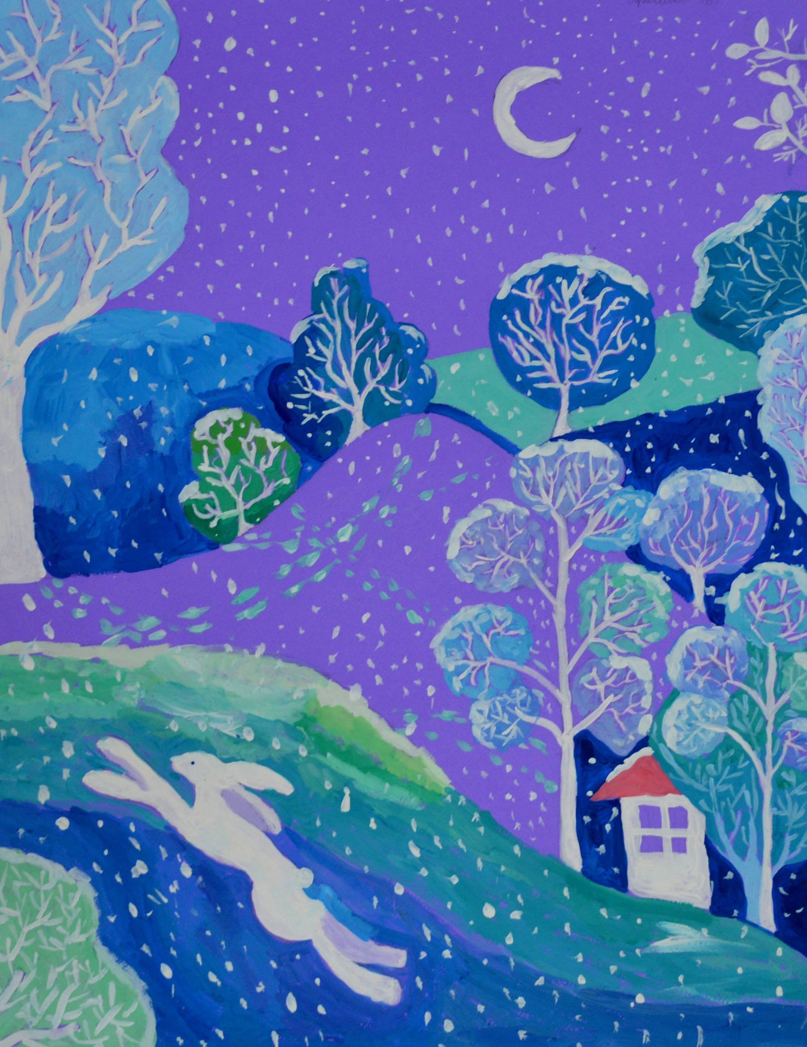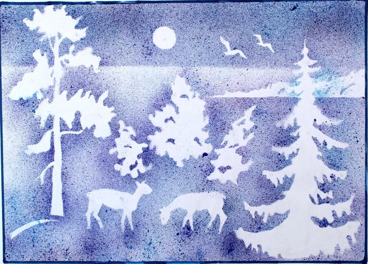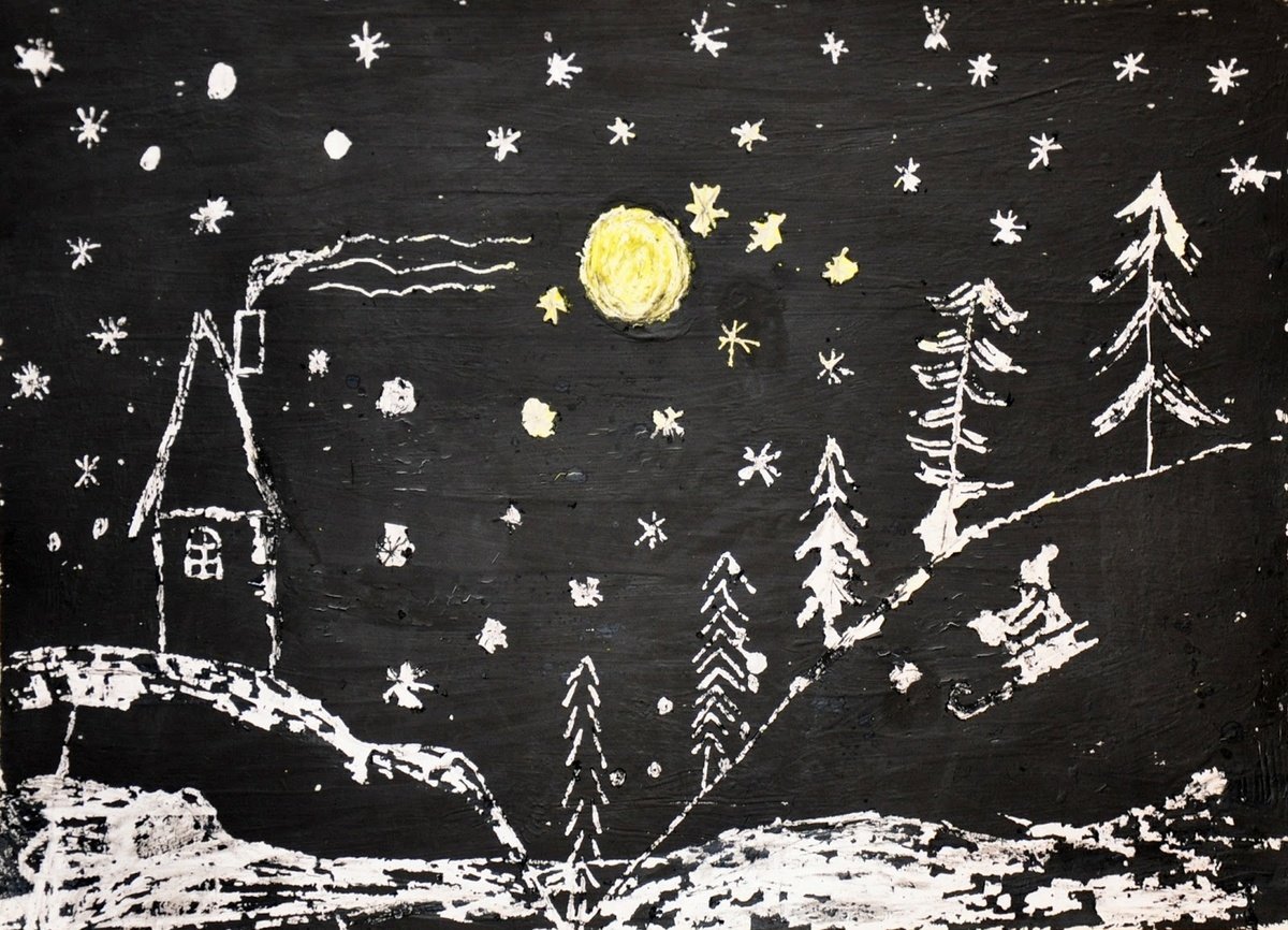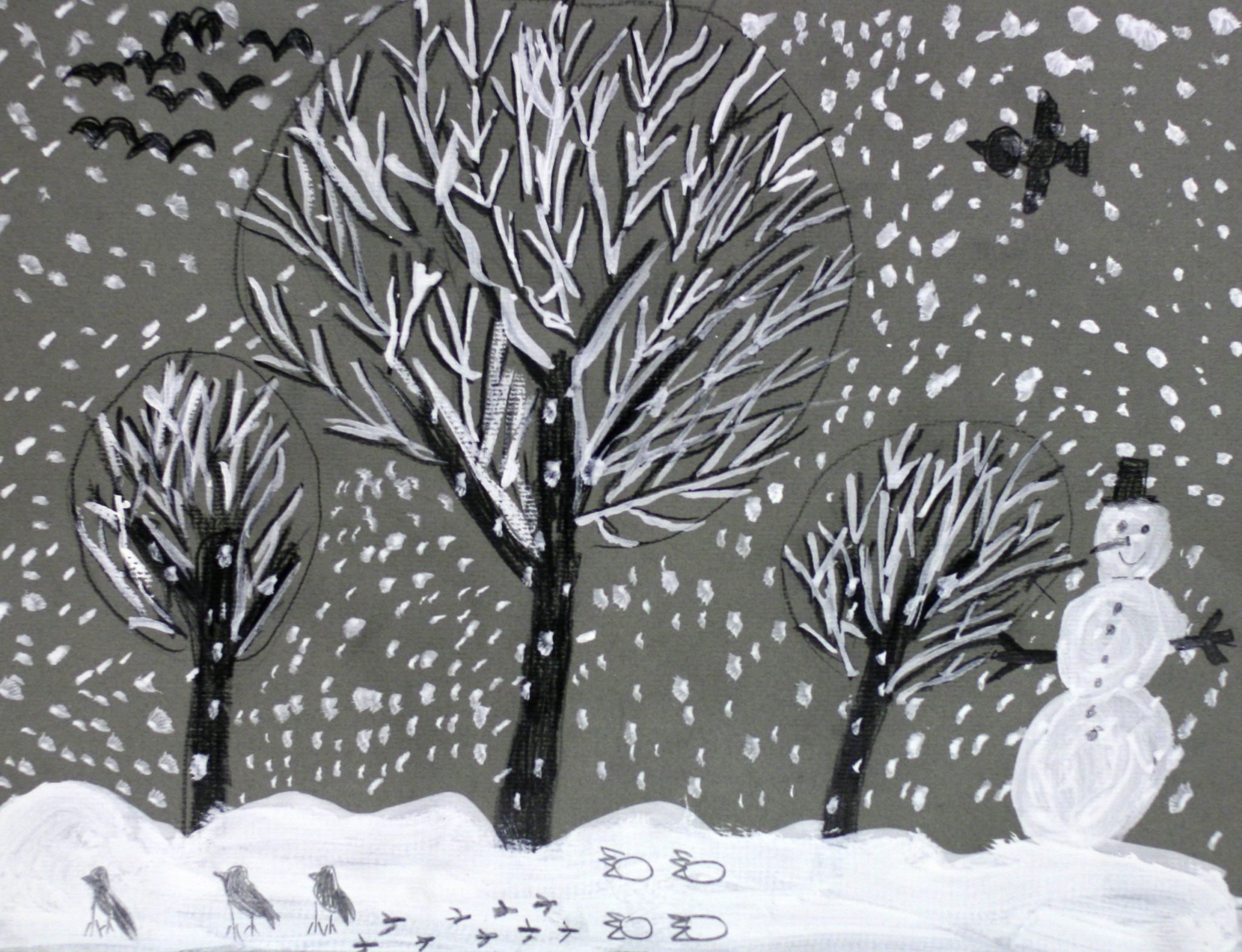 ![Зимний пейзаж белой гуашью на темном фоне]()
