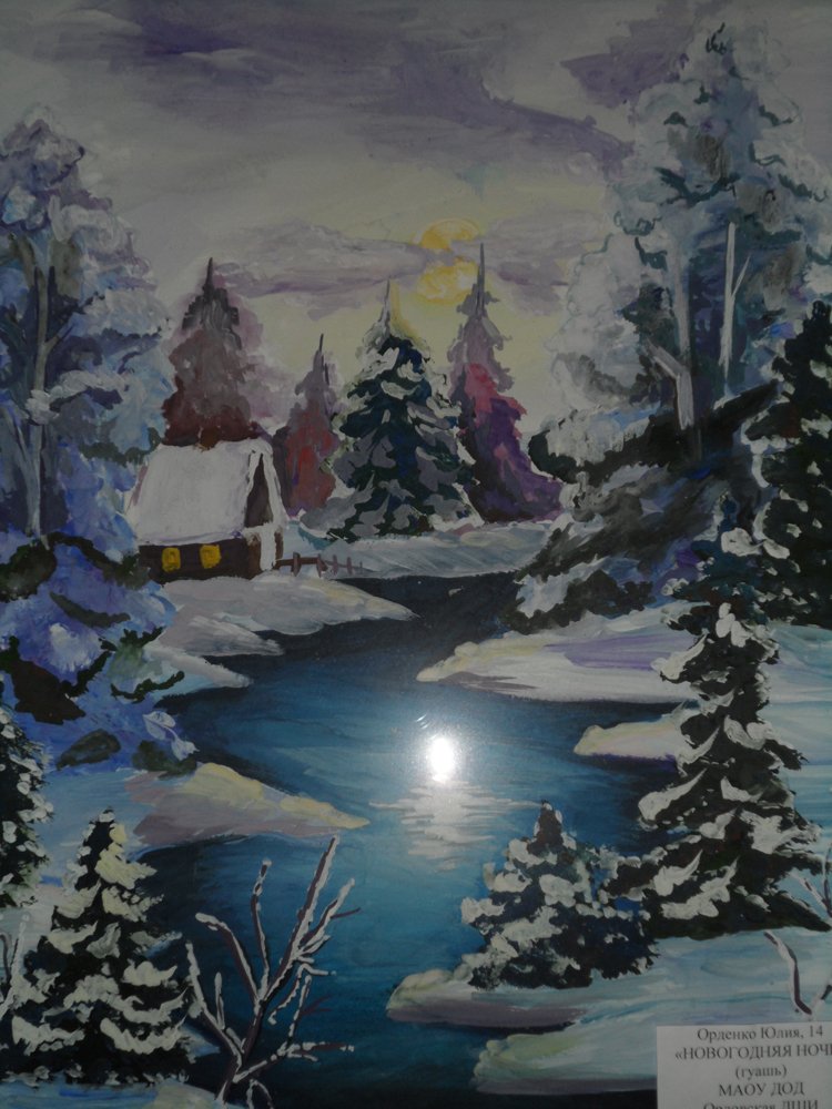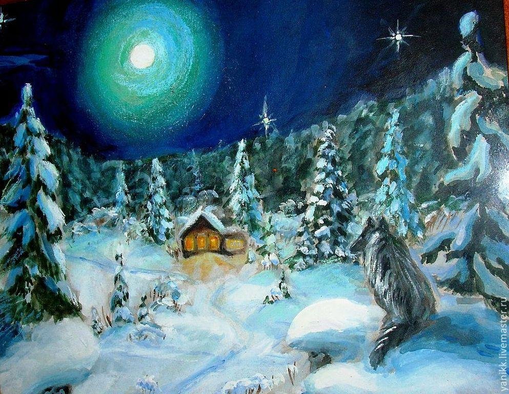 ![Ночной зимний пейзаж гуашью]()