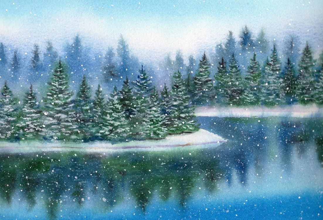 ![Зимний пейзаж елки акварелью]()