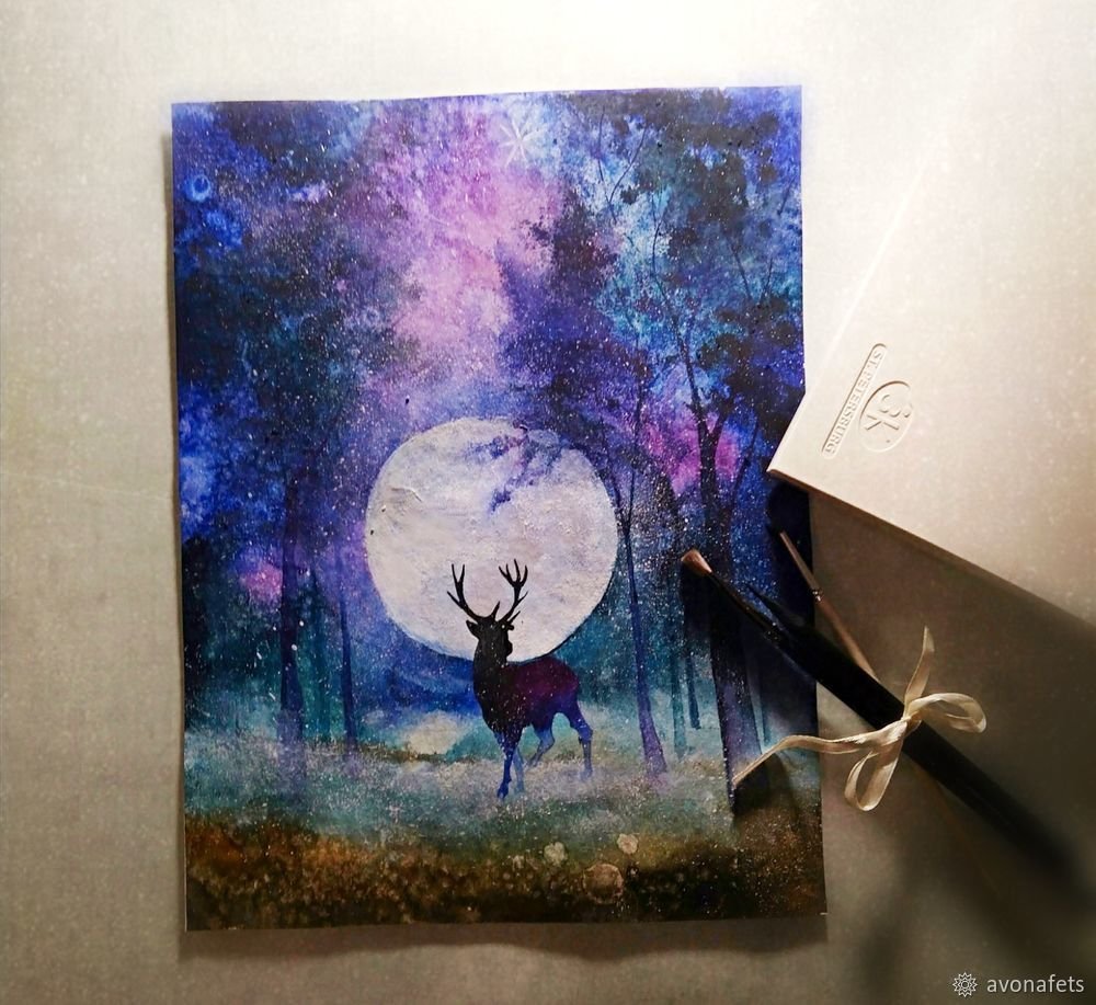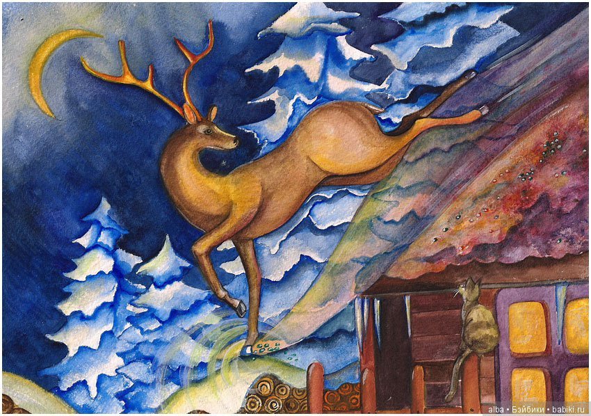 ![Зимний пейзаж с оленем рисунок]()