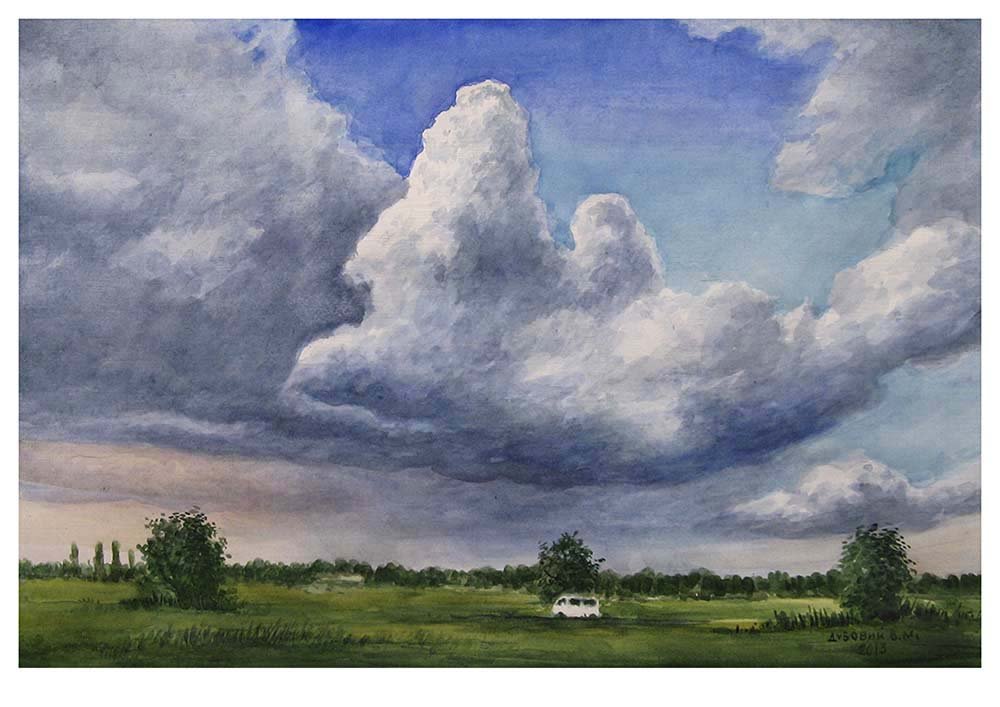 Пейзаж с облаками акварелью
