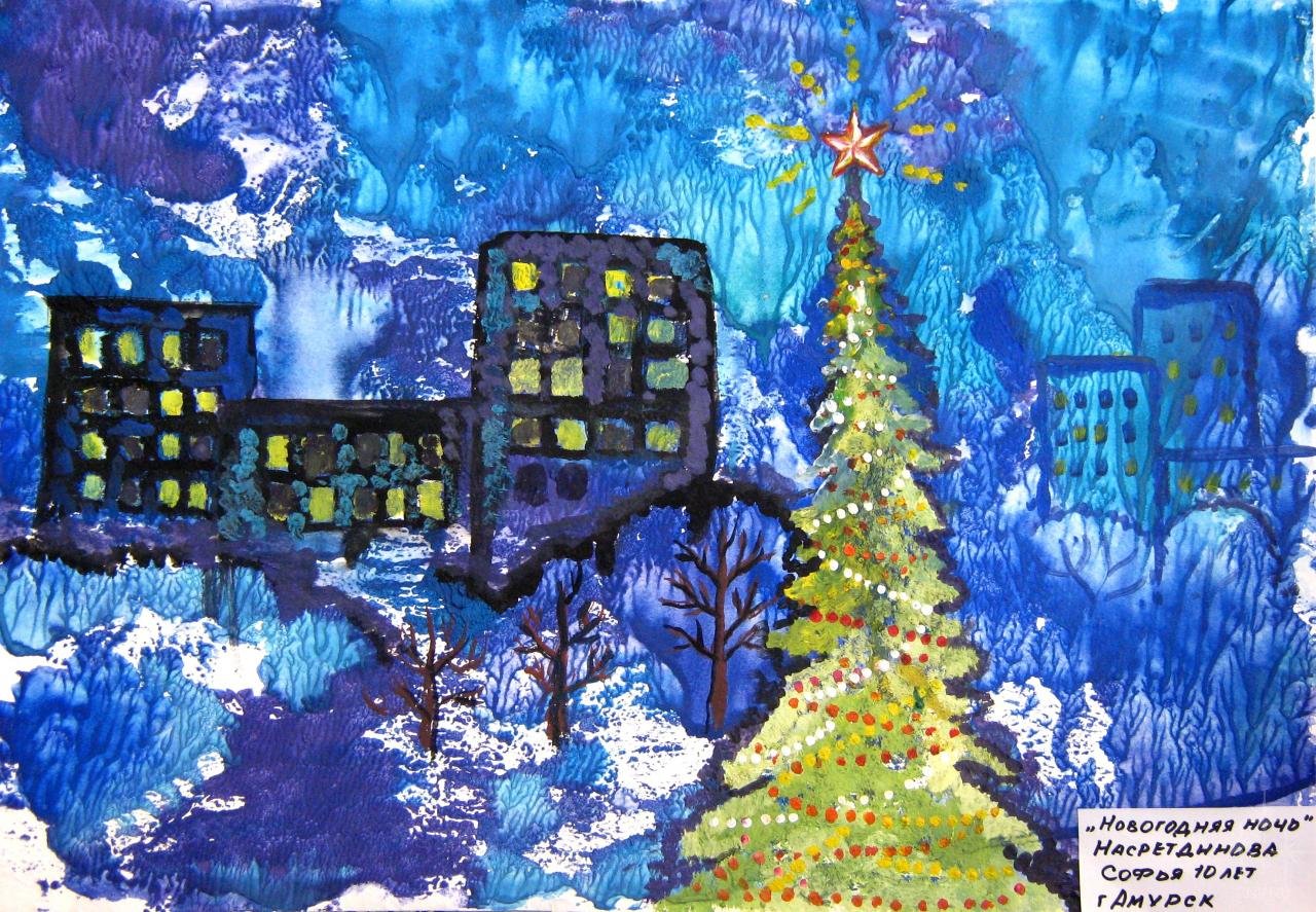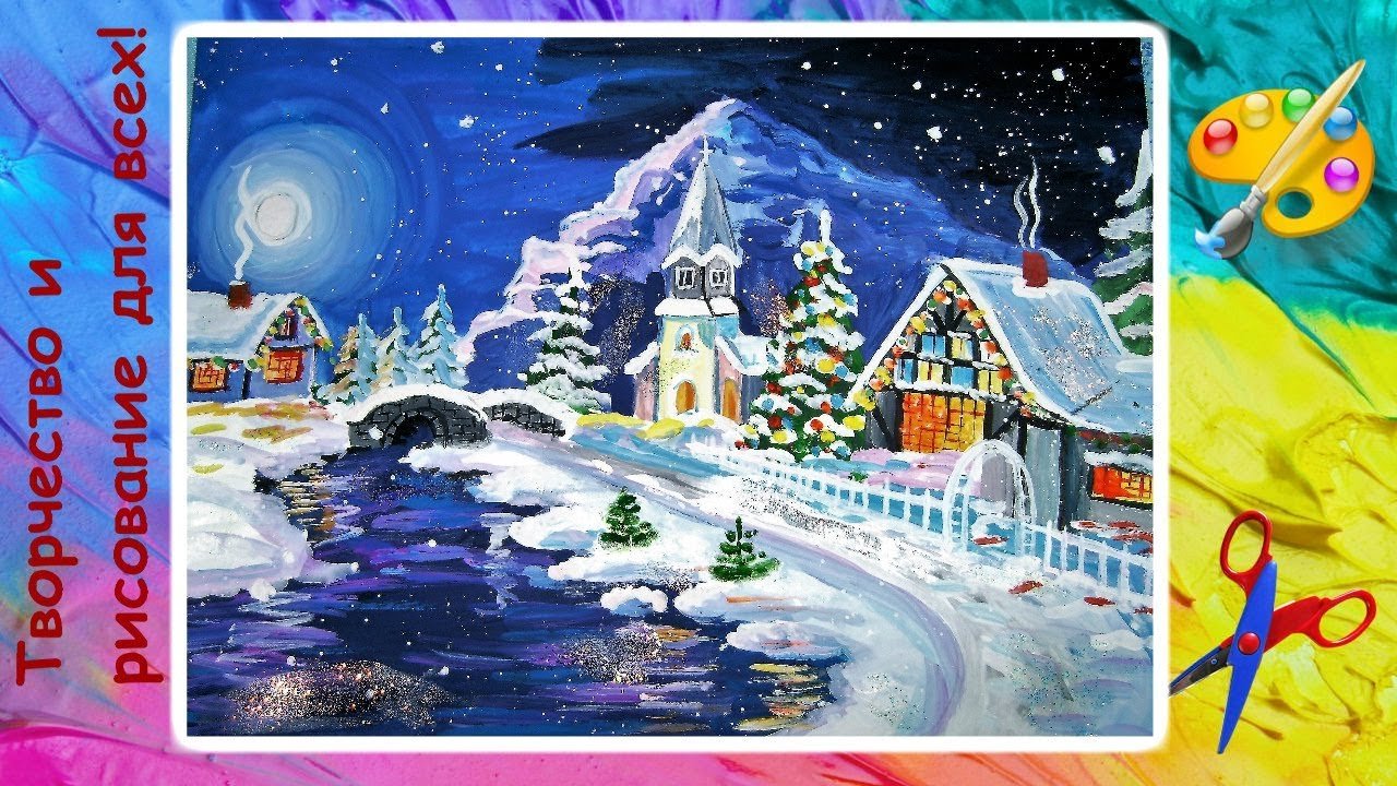 ![Новогодняя ночь рисунок гуашью]()