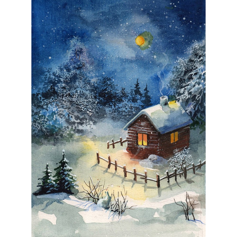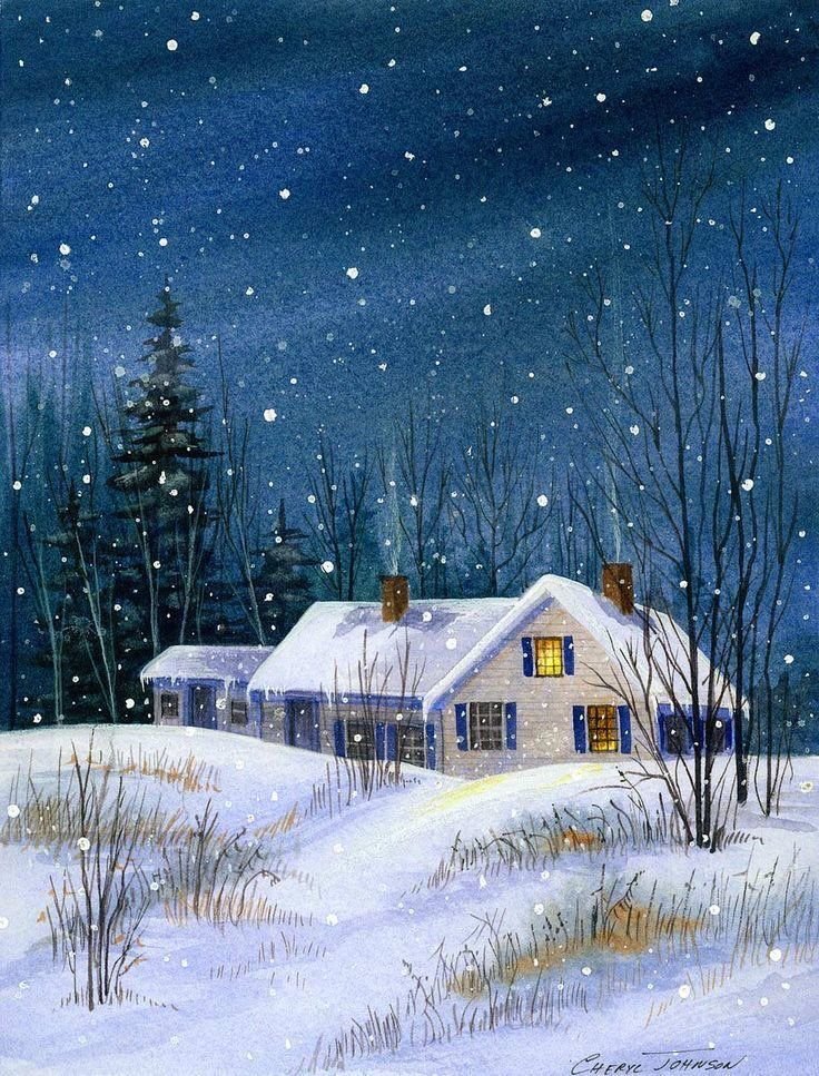 ![Зимний деревенский ночной пейзаж акварелью]()