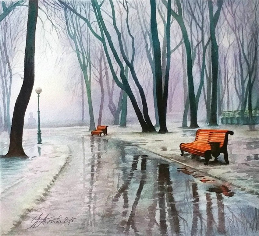 ![Скамейка в парке акварель Леонид Афремов]()