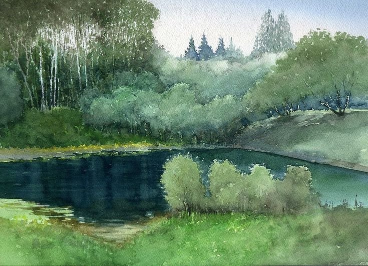 ![Пейзаж с озером акварелью]()