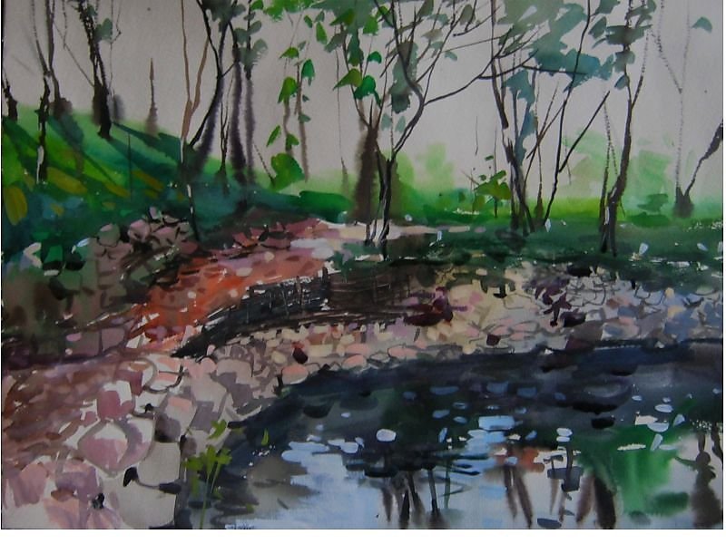 Пейзаж с речкой акварелью