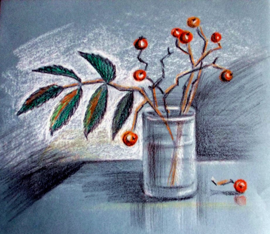 ![Натюрморт с веткой рябины карандашом]()