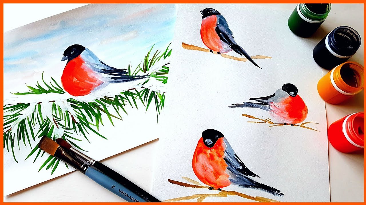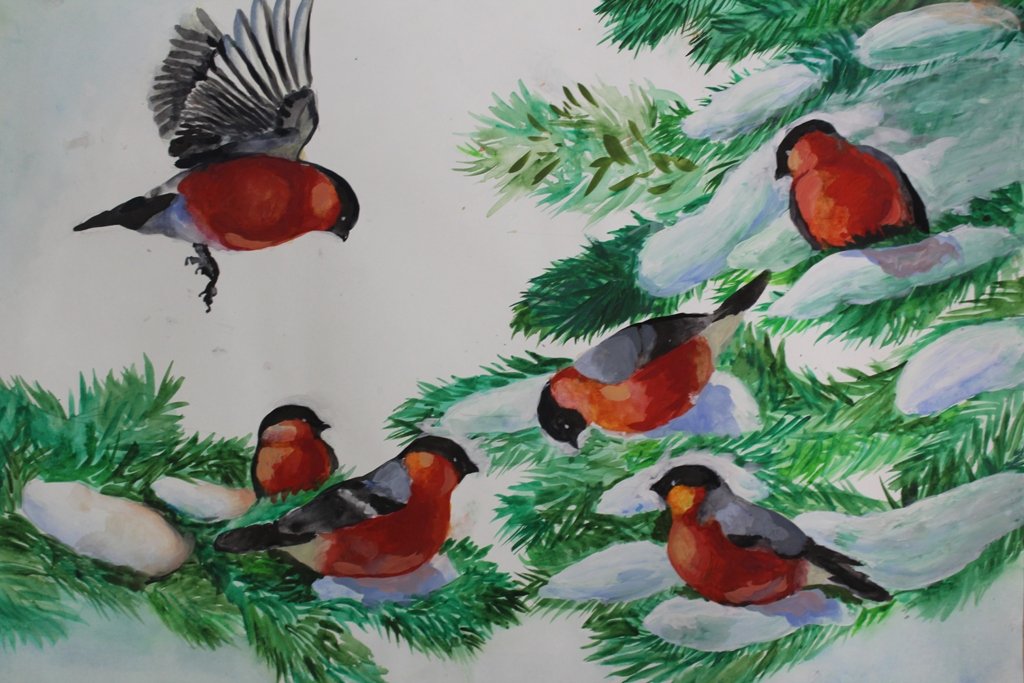 ![Снегирь на ветке гуашью]()