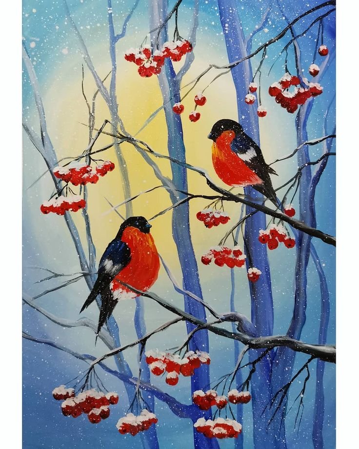 ![Снегири на стекле гуашью]()