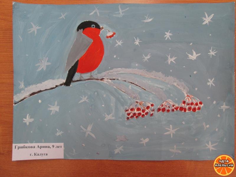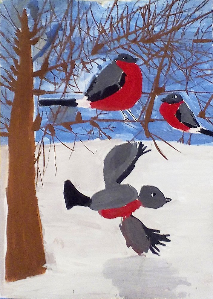 ![Снегирь гуашью для детей]()