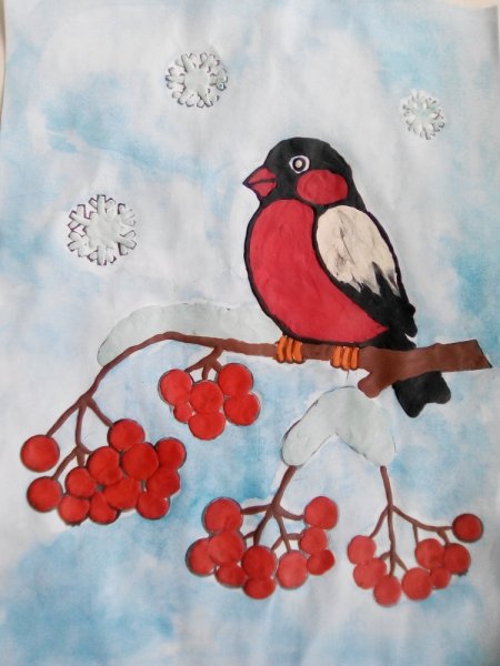 ![Снегирь красками для детей]()