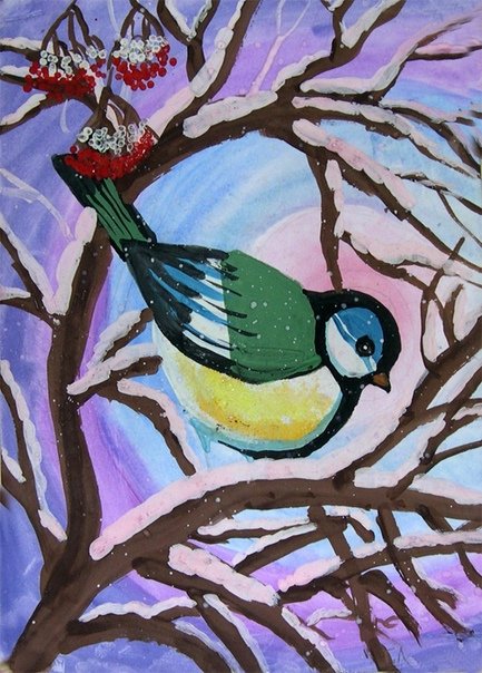 ![Синица красками для детей]()