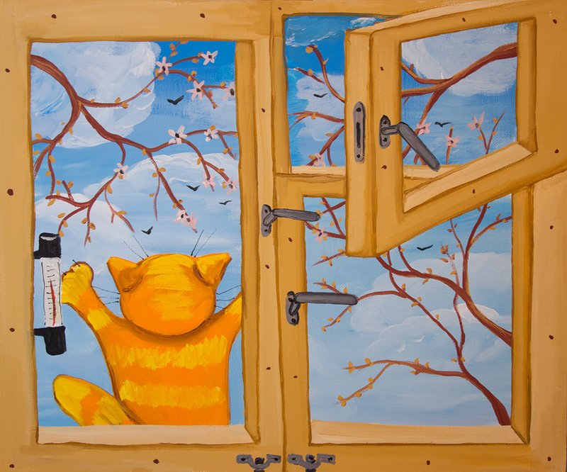 ![Кот на окне гуашью]()