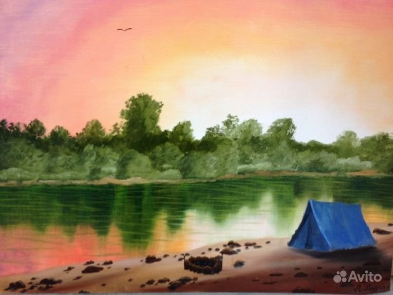 ![Пейзаж с костром акрил]()