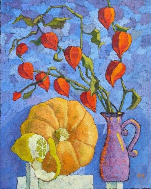 ![Осенний натюрморт с физалисом и тыквой]()