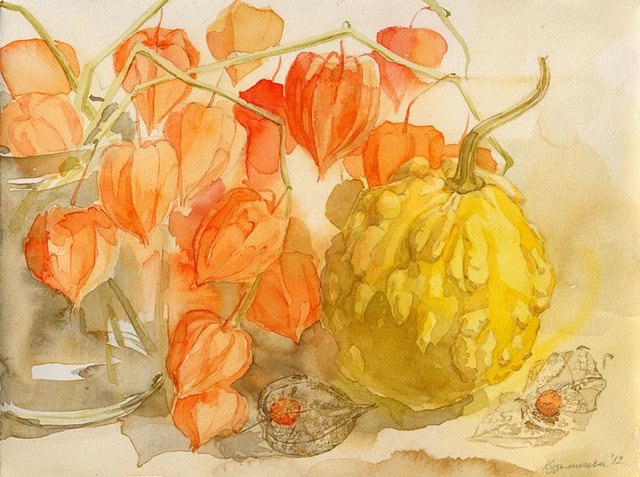 ![Тыквы и физалис акварелью]()