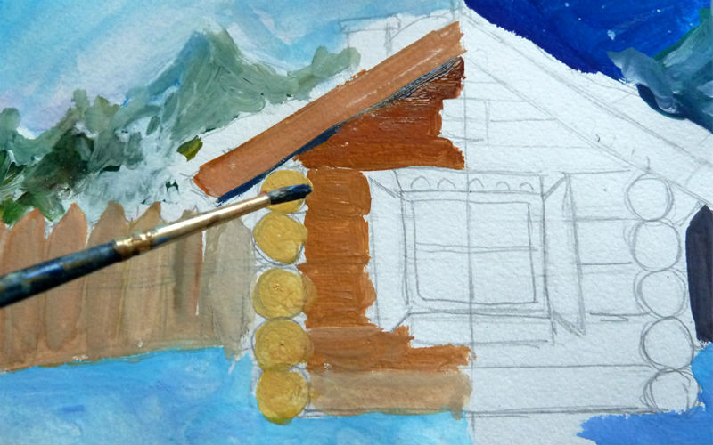Бревенчатый дом красками для детей