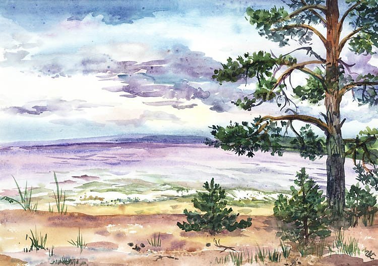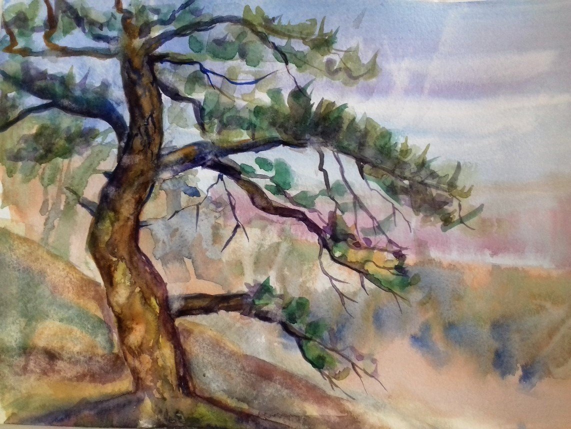 Одинокая сосна акварелью