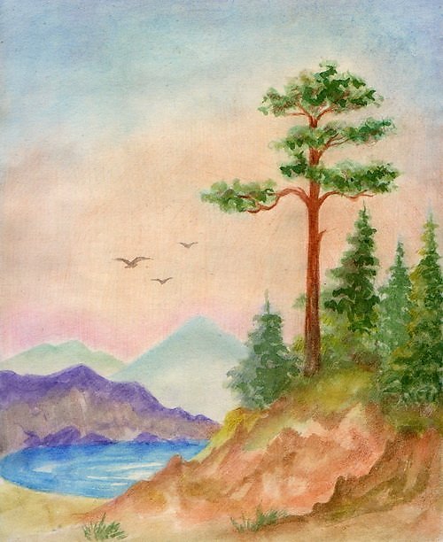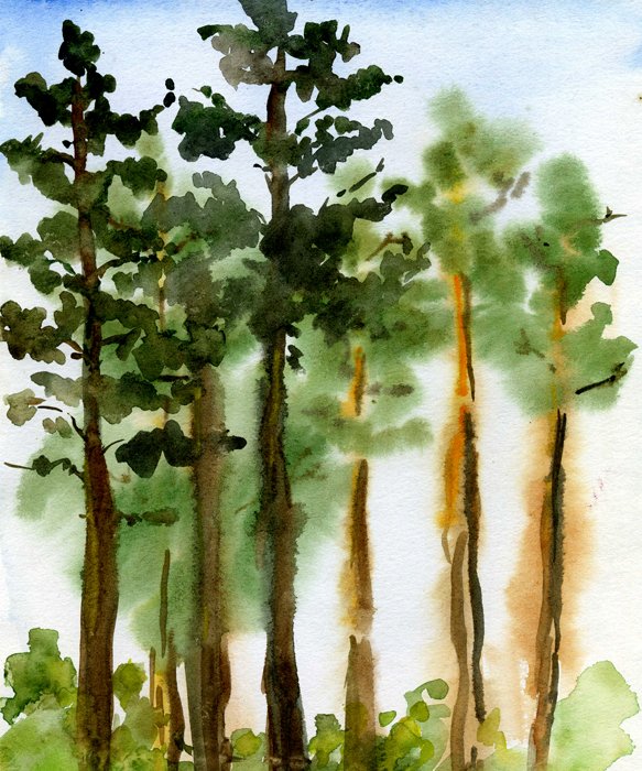 ![Акварель сосны пейзаж]()
