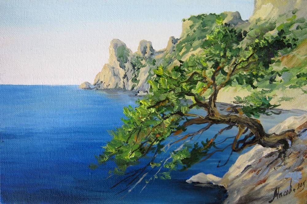 ![Крымский пейзаж море сосны маслом]()