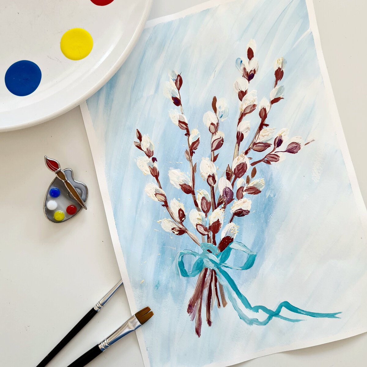 ![Рисование вербы красками]()