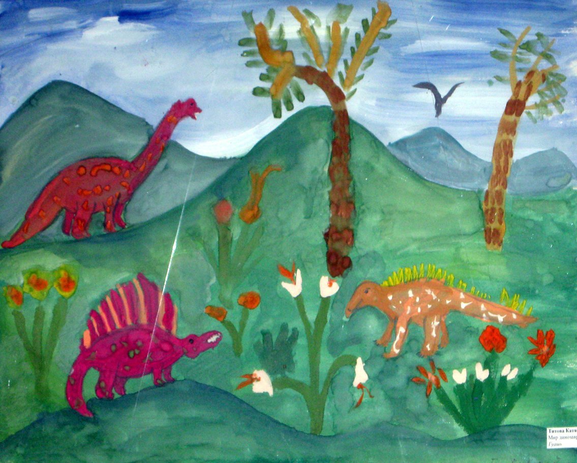 Динозавры нарисованные акварелью детьми