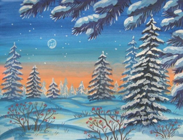 Зимний пейзаж гуашью поэтапно