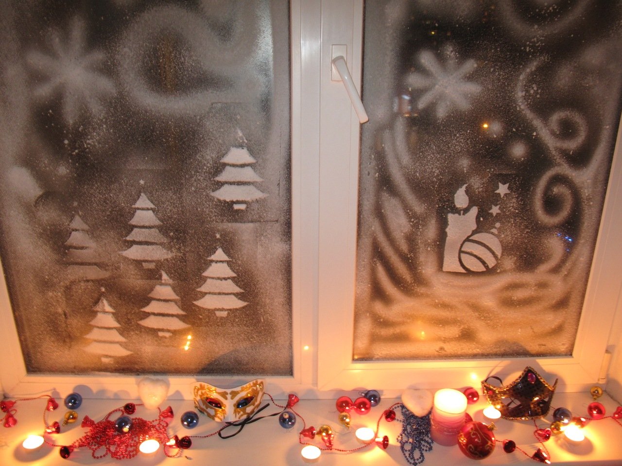 ![Новогодние рисунки на окнах]()