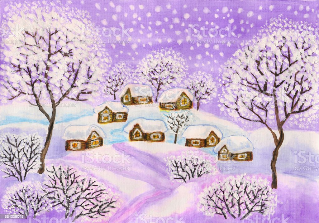 ![Зимний пейзаж гуашью в сиреневых тонах]()