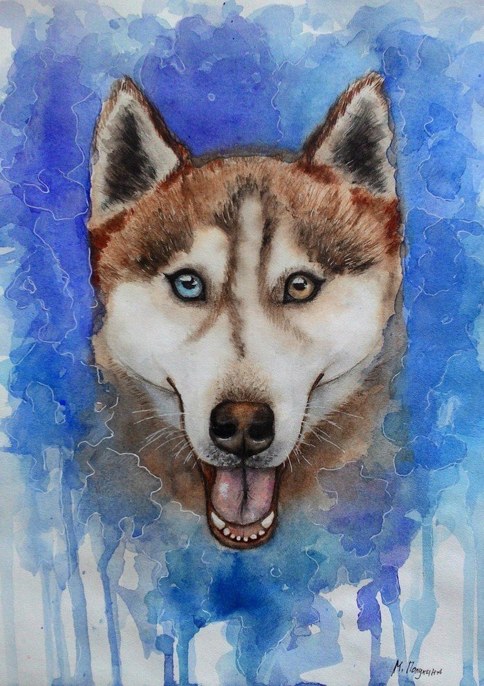 ![Хаски рисунок красками]()